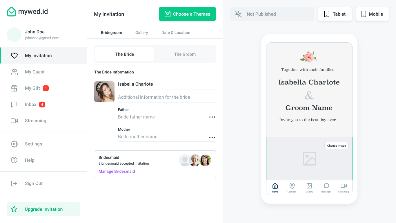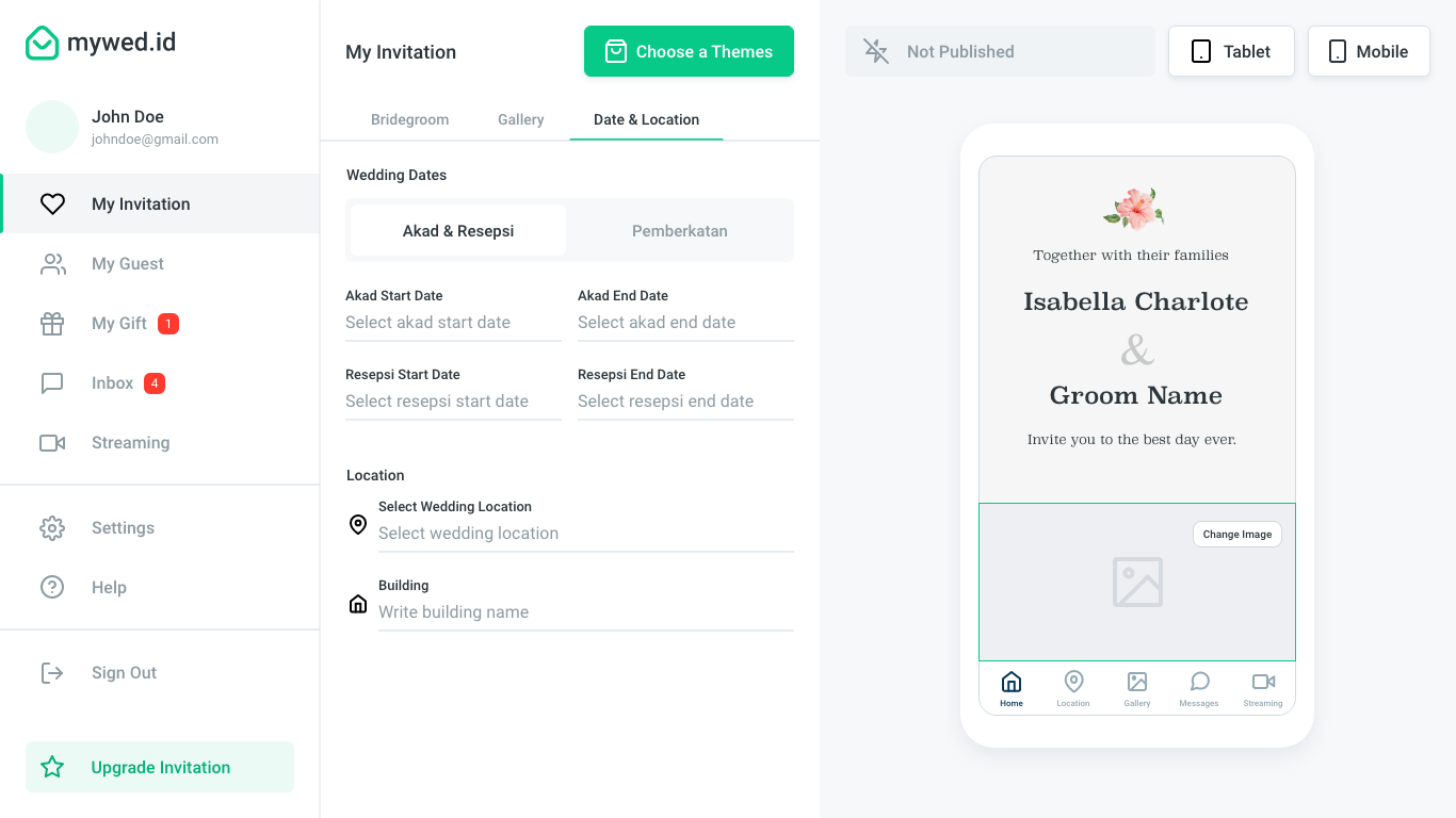 Membuat undangan di mywed.id dibikin semudah mungkin seperti kamu mengisi form dan ditampilkan dengan desain yang simpel dan elegan.