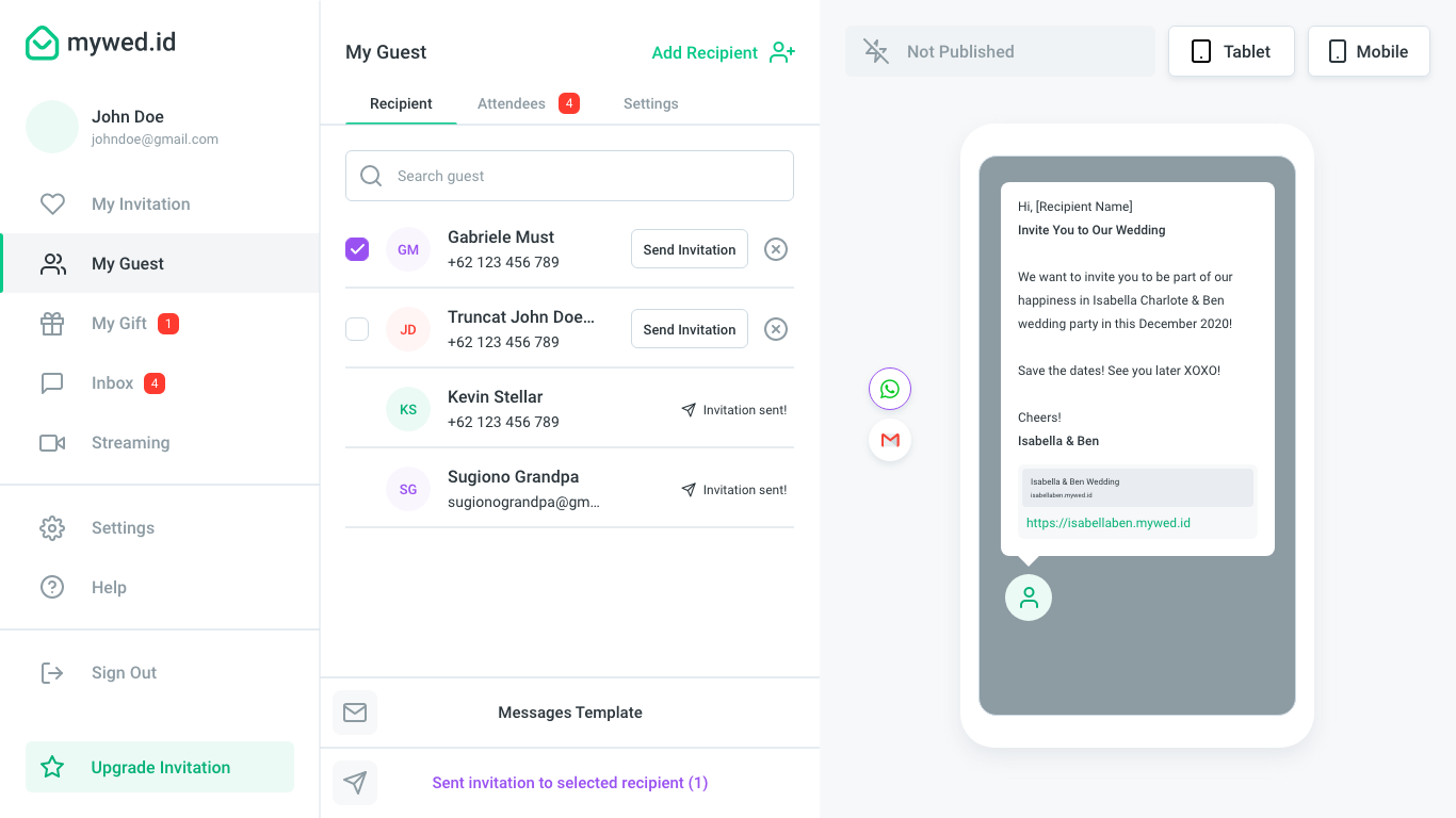 Mengirim undangan sekarang lebih mudah dengan manajemen tamu serta pengiriman pesan secara otomatis melalui email atau WhatsApp.